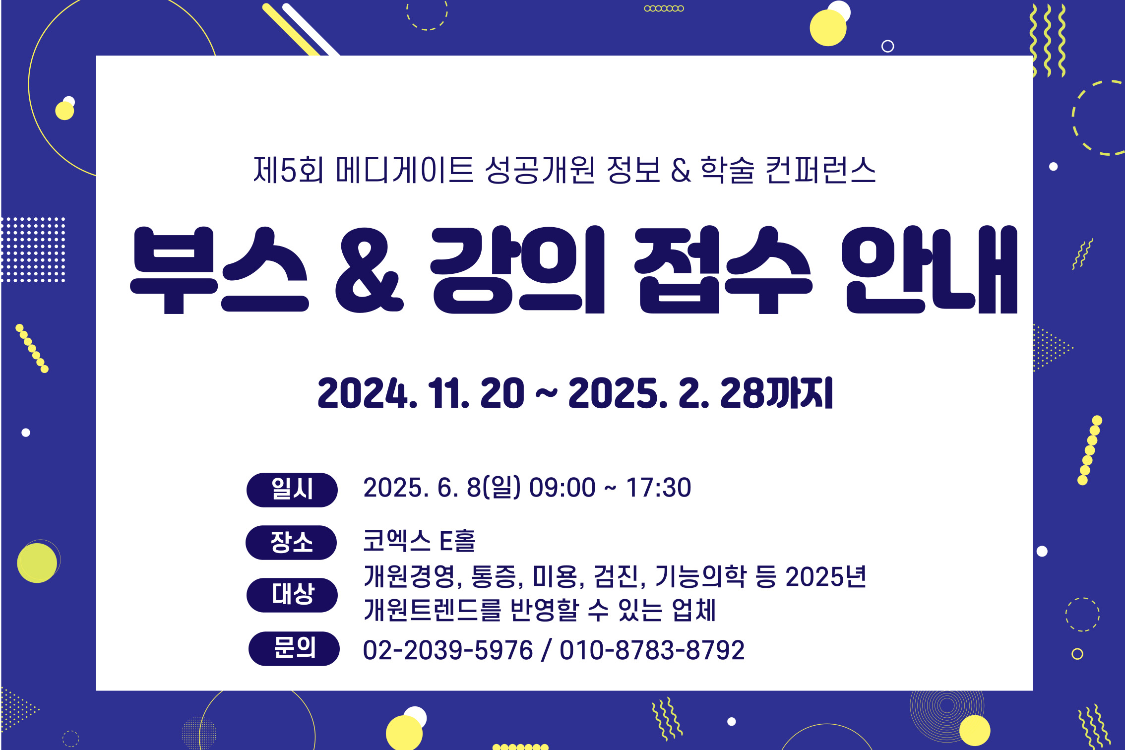 2025년 개최하는 제5회 메디게이트 성공개원 정보 & 학술 컨퍼런스에서 참가기업 및 강의 접수를 받고 있습니다.