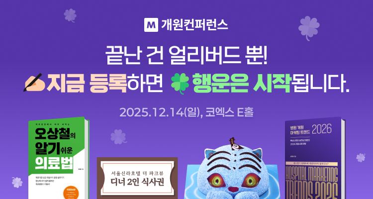 이번 이벤트는 얼리버드 등록이 종료된 이후에도 참여 의사를 밝힌 의사 회원들의 요청이 이어지며 추가로 마련됐다。 11월21일부터 12월12일까지 사전등록을 완료한 참가자 전원에게 최근 발간된 '병원 개원 마케팅 트렌드 2026'을 행사 현장에서 무료로 제공한다.