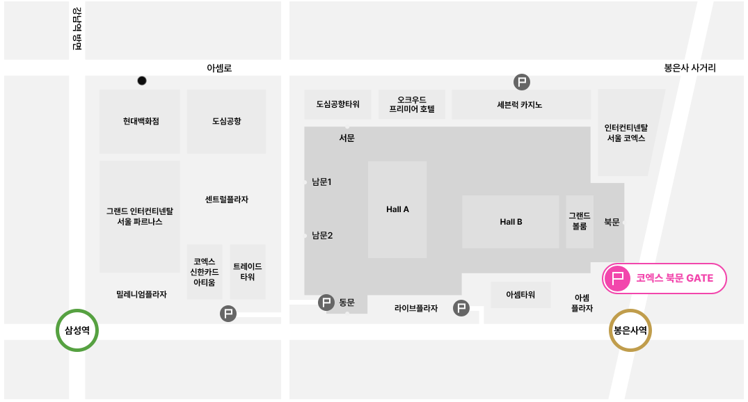코엑스 북문 Gate로 들어오셔서 주차하시면 보다 편리하게 컨퍼런스 E로 방문하실 수 있습니다.